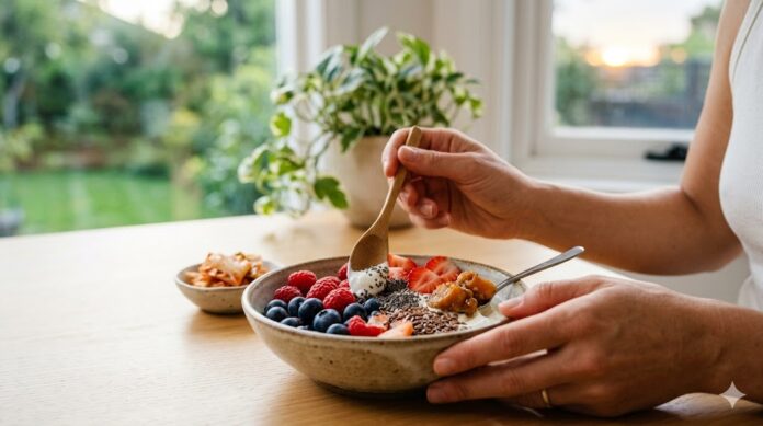 식이섬유가 풍부한 ‘장-친화 식단’: 채소, 과일, 통곡물, 해조류 등 식이섬유가 풍부한 음식은 장내 유익균의 먹이(프리바이오틱스)가 되어 균형 잡힌 미생물 생태계를 만듭니다. (이미지 참고)